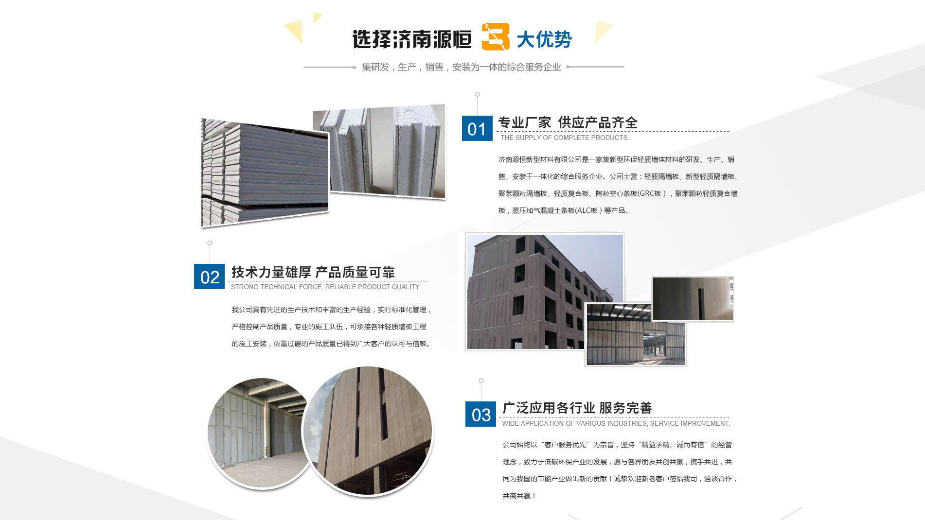 濟南源恒新型材料有限公司坐落于美麗的泉城濟南,是集新型環(huán)保輕質(zhì)墻體材料的研發(fā)、生產(chǎn)、銷售、安裝于一體化的綜合服務(wù)企業(yè)。我公司具有的生產(chǎn)技術(shù)和豐富的生產(chǎn)經(jīng)驗,為您提供輕質(zhì)隔墻板、新型輕質(zhì)隔墻板、聚苯顆粒隔墻板、輕質(zhì)復合板、陶??招臈l板(GRC板),聚苯顆粒輕質(zhì)復合墻板,蒸壓加氣混凝土條板(ALC板)等產(chǎn)品,本公司有專的施工隊伍,可承接各種輕質(zhì)墻板工程的施工安裝。輕質(zhì)隔墻板是國家推廣使用的新型輕質(zhì)、綠色無害建材,是墻改節(jié)能政策大力扶持的環(huán)保節(jié)能產(chǎn)品,是發(fā)達國家普遍采用的新型墻體材料。濟南源恒新型材料有限公司實行標準化管理,嚴格控制產(chǎn)品質(zhì)量,依靠過硬的產(chǎn)品質(zhì)量已得到廣大客戶的認可與信賴。公司產(chǎn)品遍布各大城市,與國內(nèi)多家客戶建立了良好的合作關(guān)系。公司始終以“客戶服務(wù)優(yōu)先”為宗旨,堅持“精益求精、誠而有信”的經(jīng)營理念,致力于低碳環(huán)保產(chǎn)業(yè)的發(fā)展,愿與各界朋友共創(chuàng)共贏,攜手共進,共同為我國的節(jié)能產(chǎn)業(yè)做出新的...